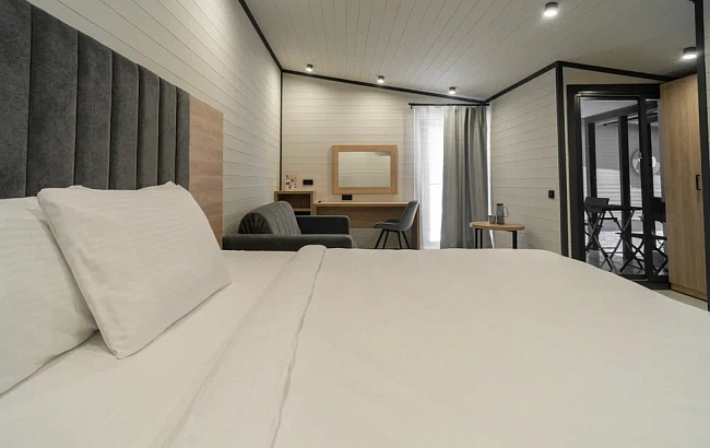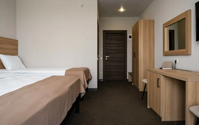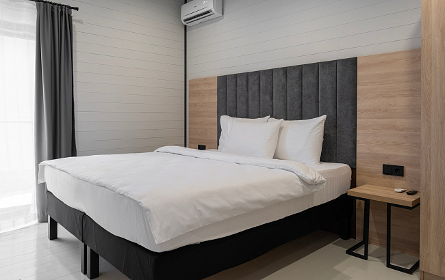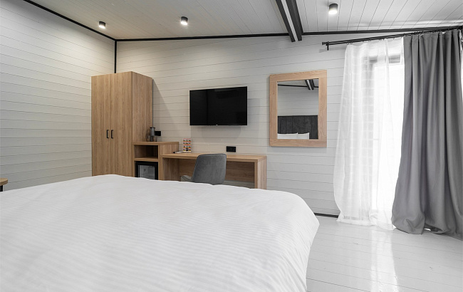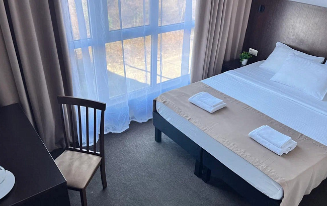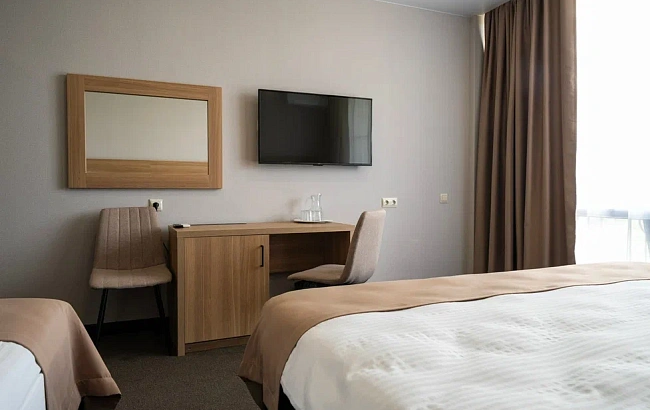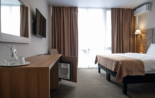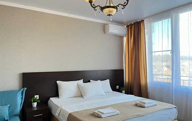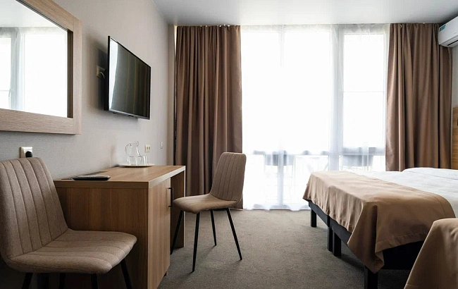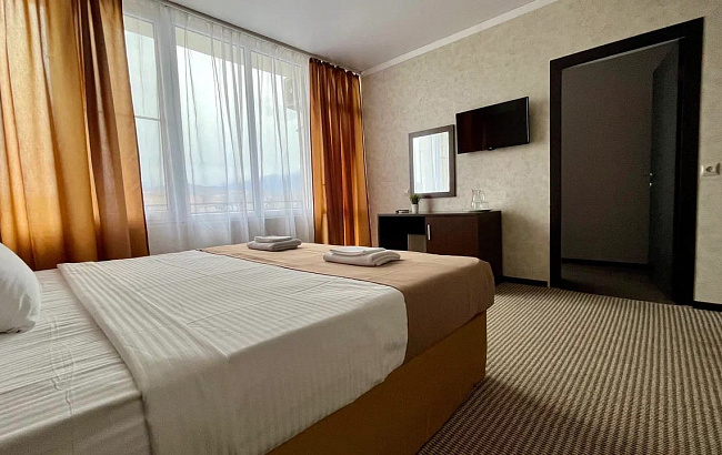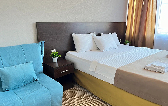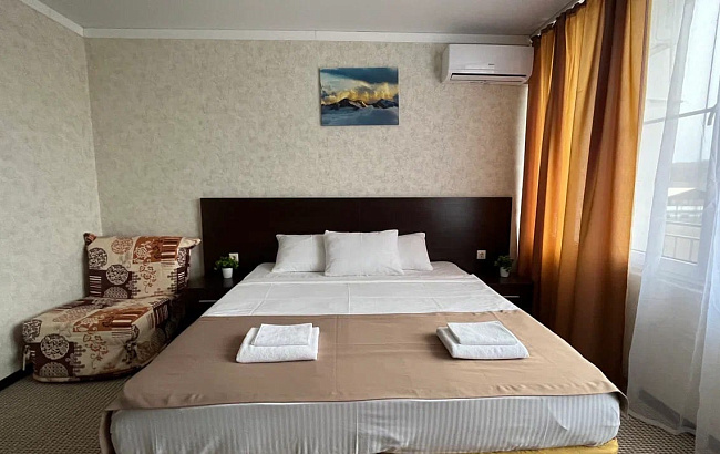В номере: двуспальная или две односпальные кровати, диван, телевизор, кондиционер, мини-холодильник, утюг, санузел с душем, фен, мини-терраса.