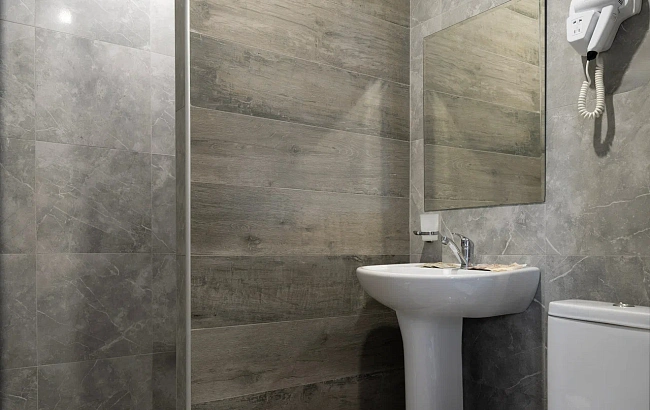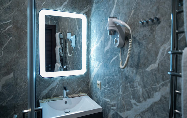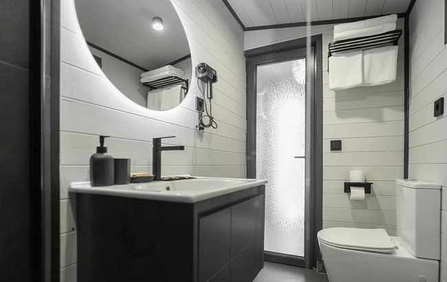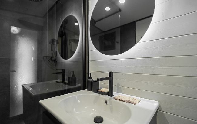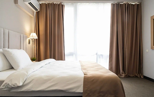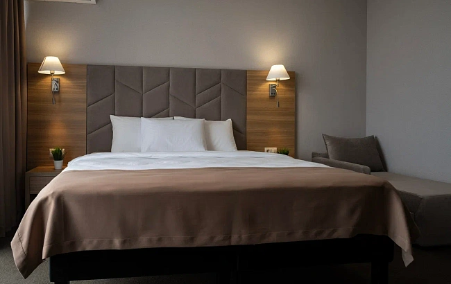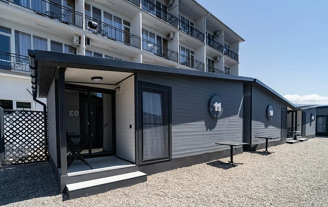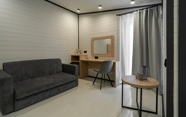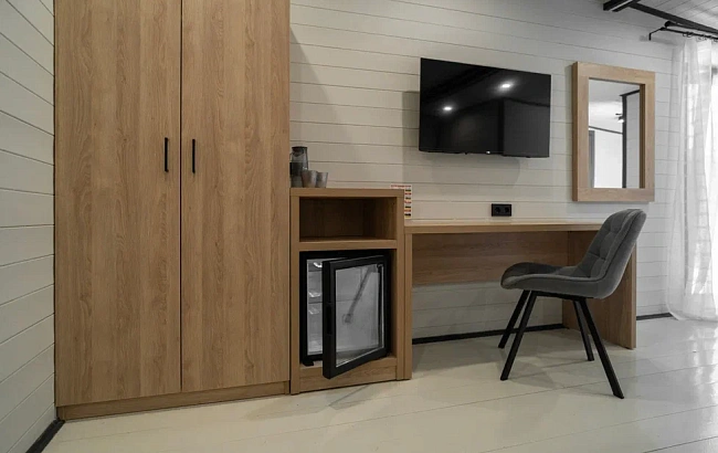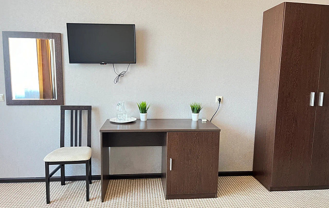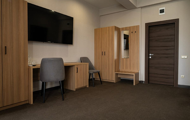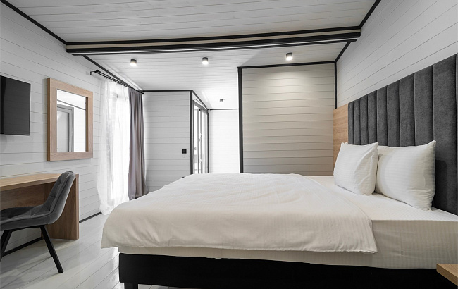 В номере: двуспальная или две односпальные кровати, диван, телевизор, кондиционер, мини-холодильник, утюг, санузел с душем, фен, мини-терраса.