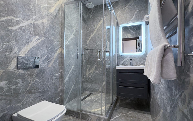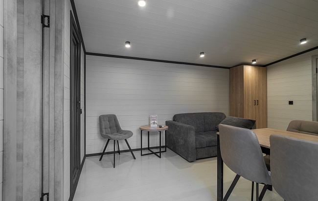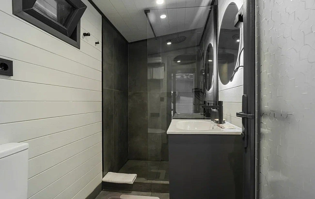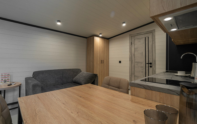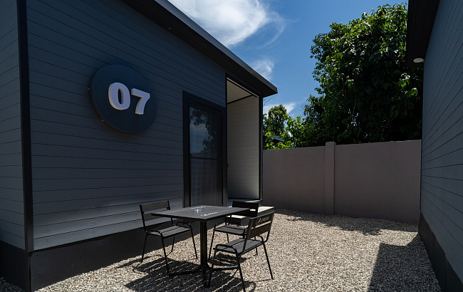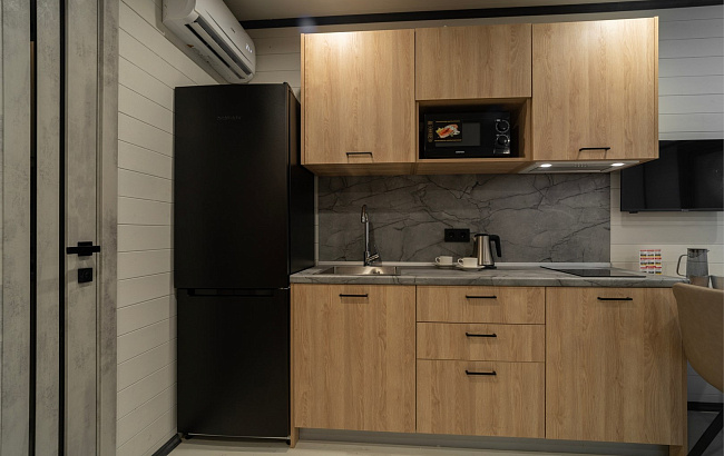 Состоит из 2 спален и гостиной. В номере: две двуспальные кровати, мягкая мебель, обеденный стол, кухонная зона, варочная поверхность, СВЧ-печь, телевизор, кондиционер, холодильник, электрочайник, утюг, санузел с душем, фен, тапочки, мини-терраса.