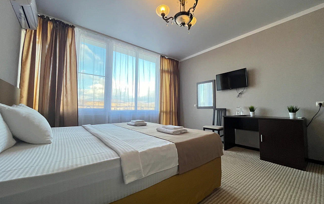 В номере: двуспальная или две односпальные кровати, кресло-кровать, телевизор, кондиционер, мини-холодильник, утюг, санузел с душем, фен, тапочки, мини-терраса.